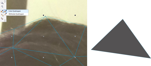 Supaya cepat, pertama klik segitiga yang akan diwarnai, lalu klik eye dropped tool, klik lagi segitiganya. Maka dari itu, lebih baik setting shortcut keyboard eye dropped tool sebelumnya supaya lebih cepat. Pilihlah warna rata-rata dari gambar yang berada di belakang segitiga tersebut, supaya nyambung warnanya sama segitiga yang lain.